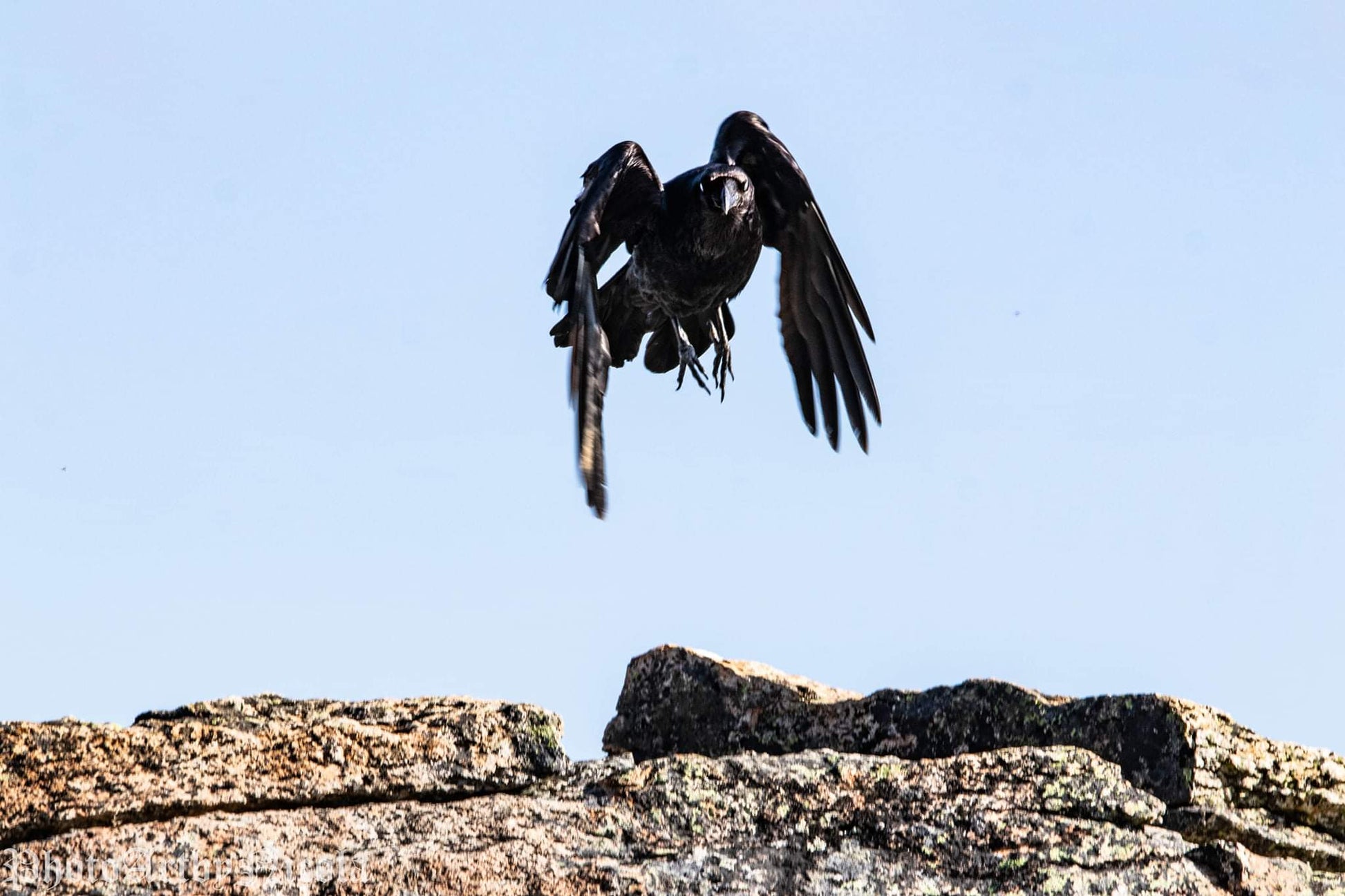 A Raven in the mountains takes its leap into flight as it bounds from where it had been sitting.